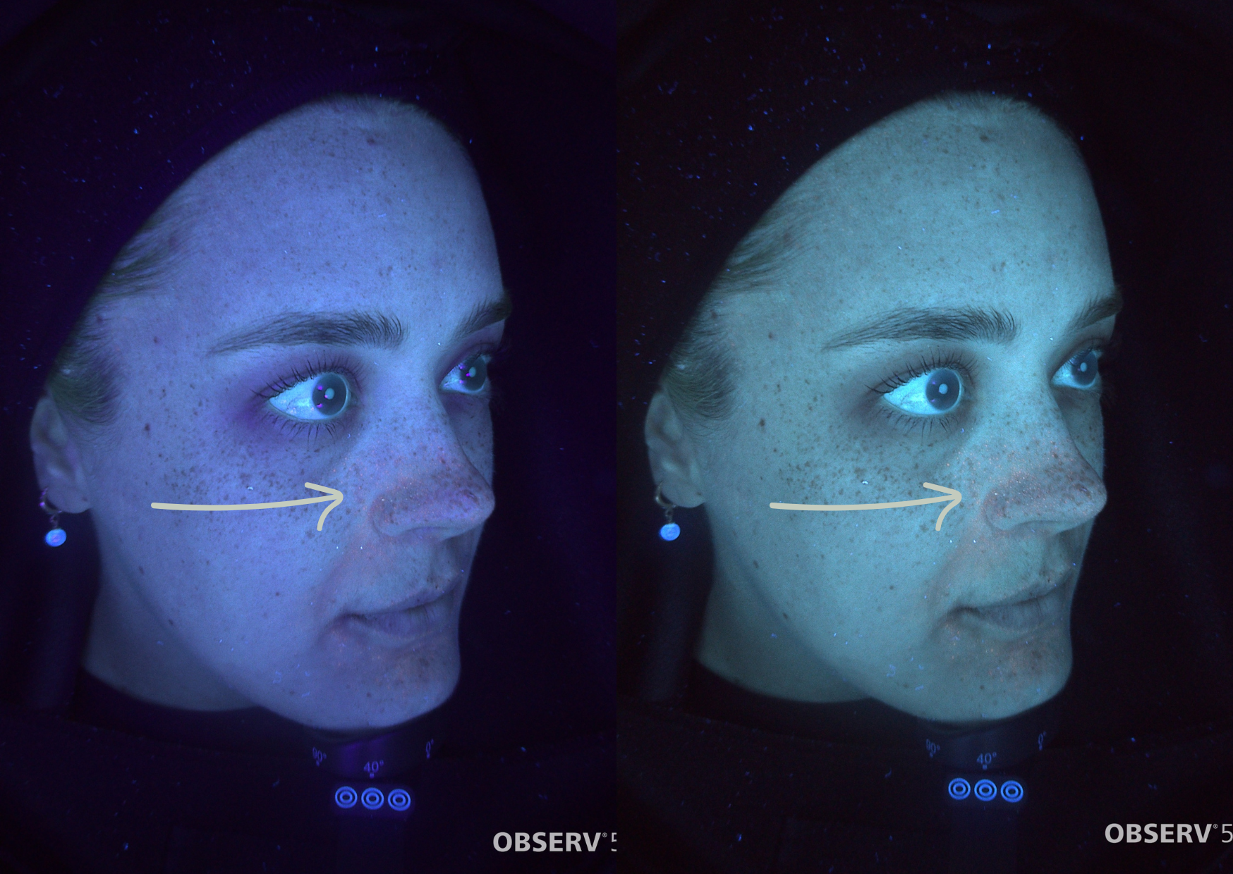 In these Observ scans, you may notice small orange spots across the skin surface. These represent sebaceous filaments, the natural structures inside your pores that help transport sebum (your skin’s natural oil) to the surface.